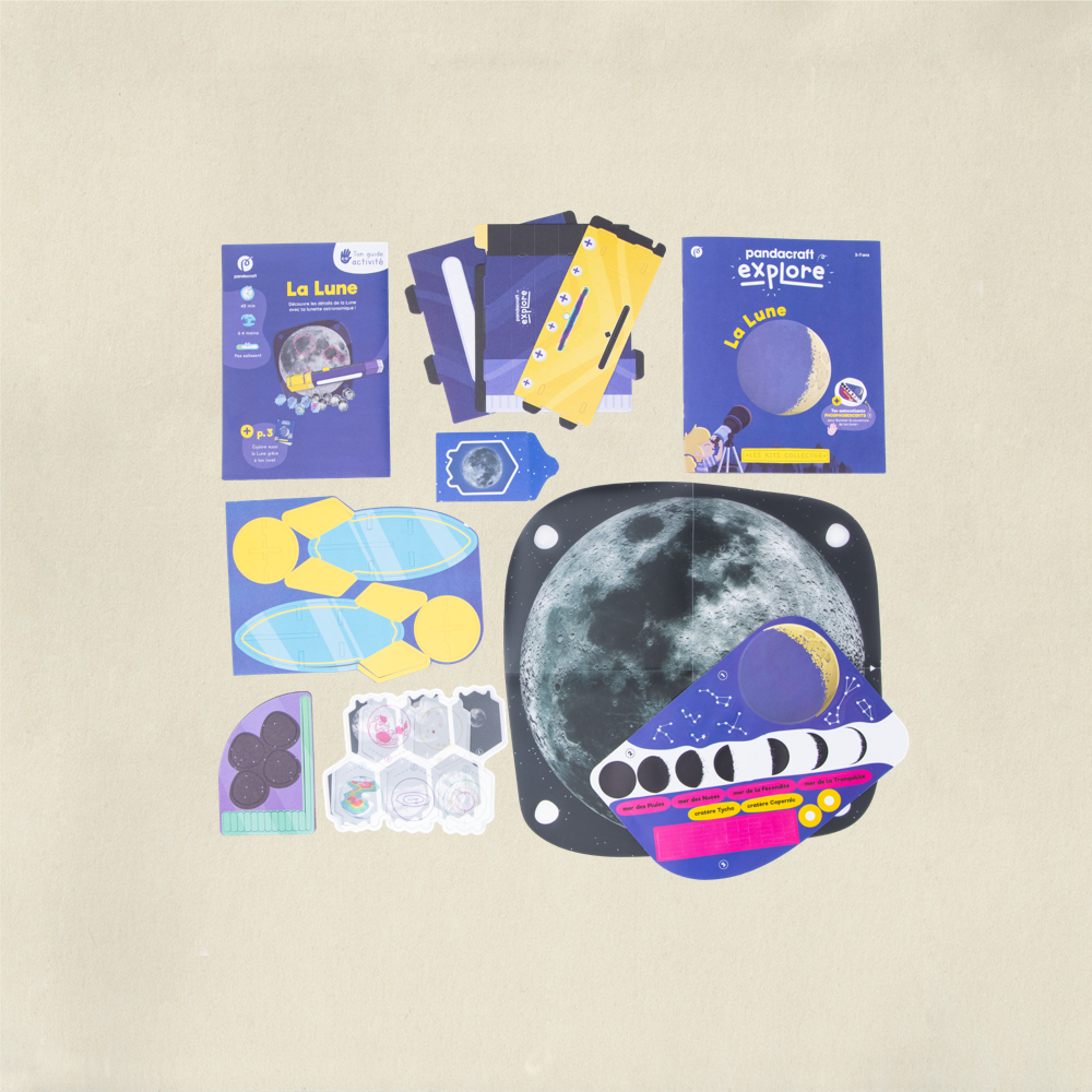 Construis une fusée phosphorescente, une carte de la Lune avec ses cratères et ses mers, et même ta première lunette astronomique pour voir la Lune sous tous ses angles grâce à des vignettes à insérer.