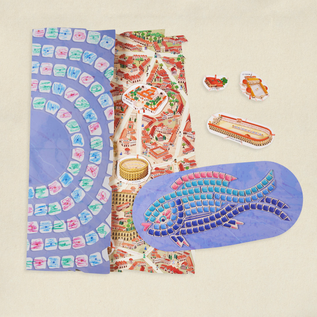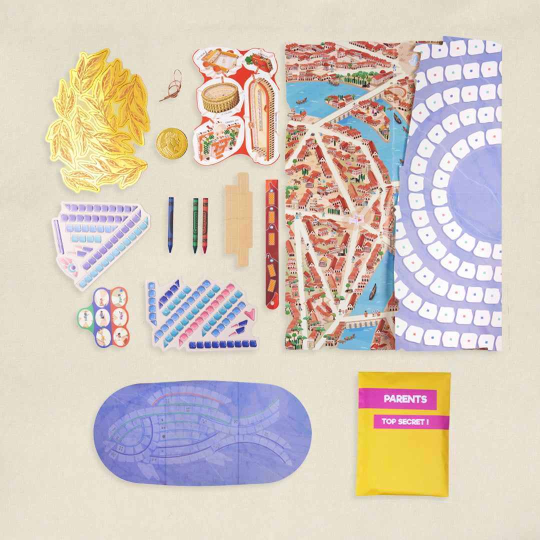 Plonge dans les rues de Rome pour une chasse au trésor sous des airs de cherche et trouve géant ! Sauras-tu retrouver la couronne de l’empereur à temps ? Vis la vie quotidienne des Romains : leur école, leur maison et leurs activités préférées ! Assiste à une course de chars, prends un bain aux thermes et termine ta journée dans une domus, la maison romaine !